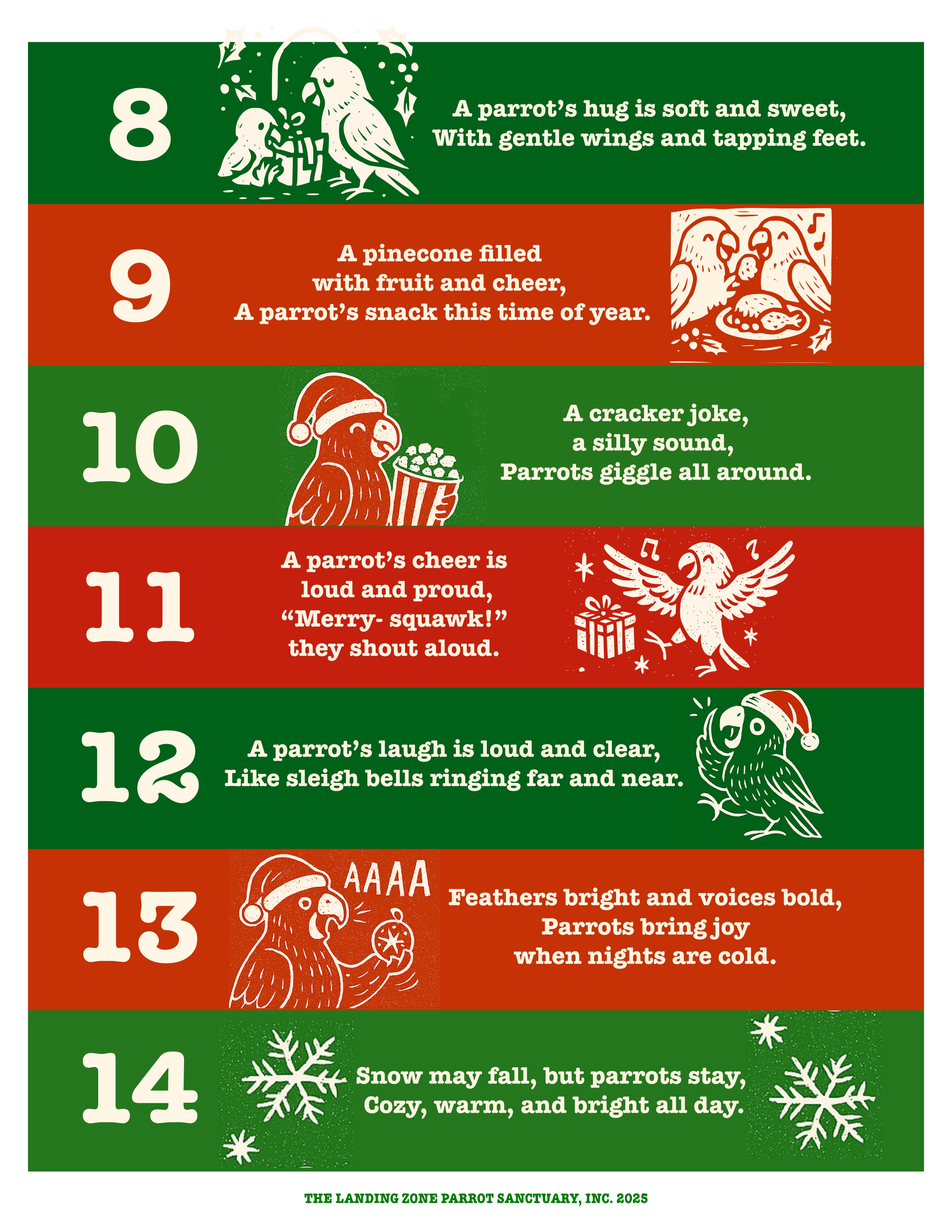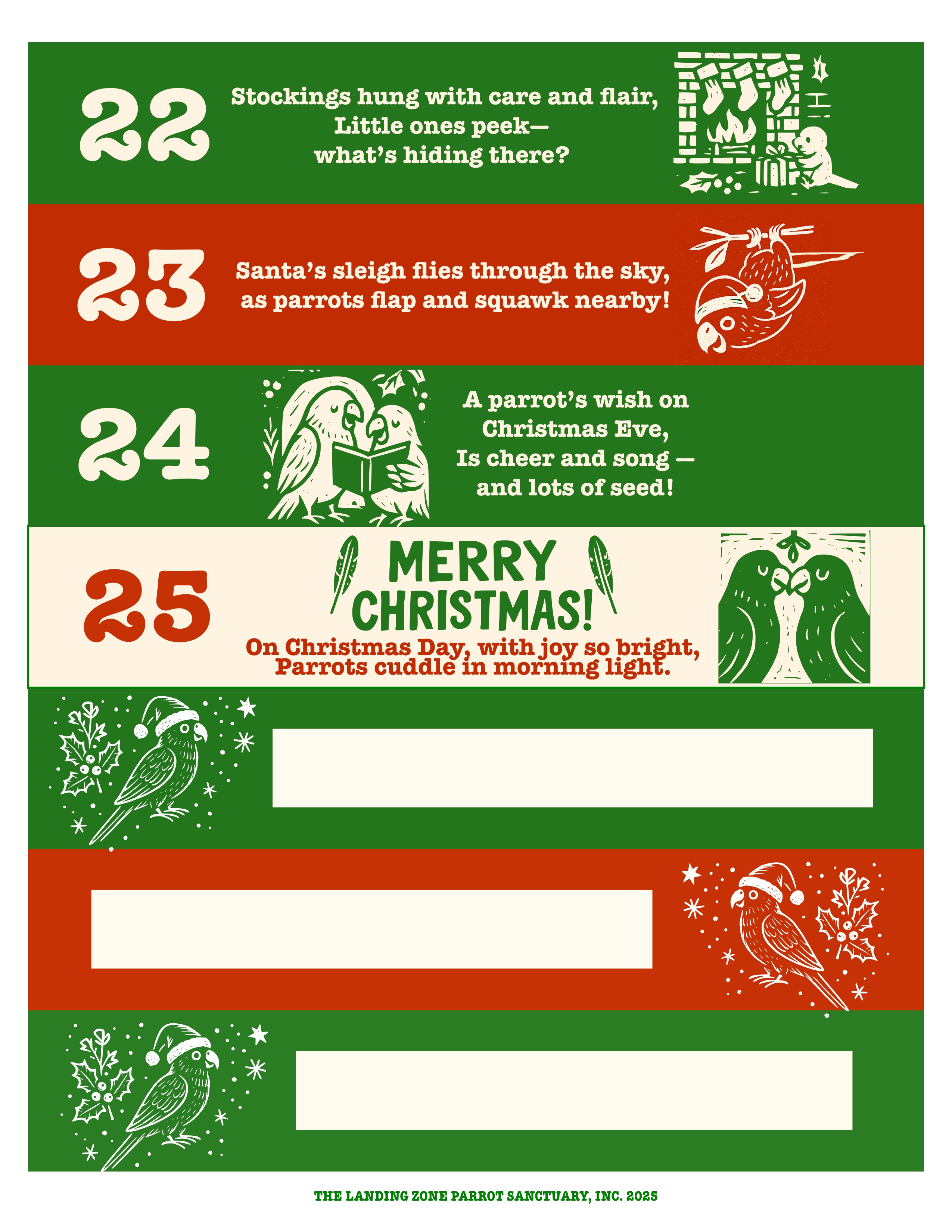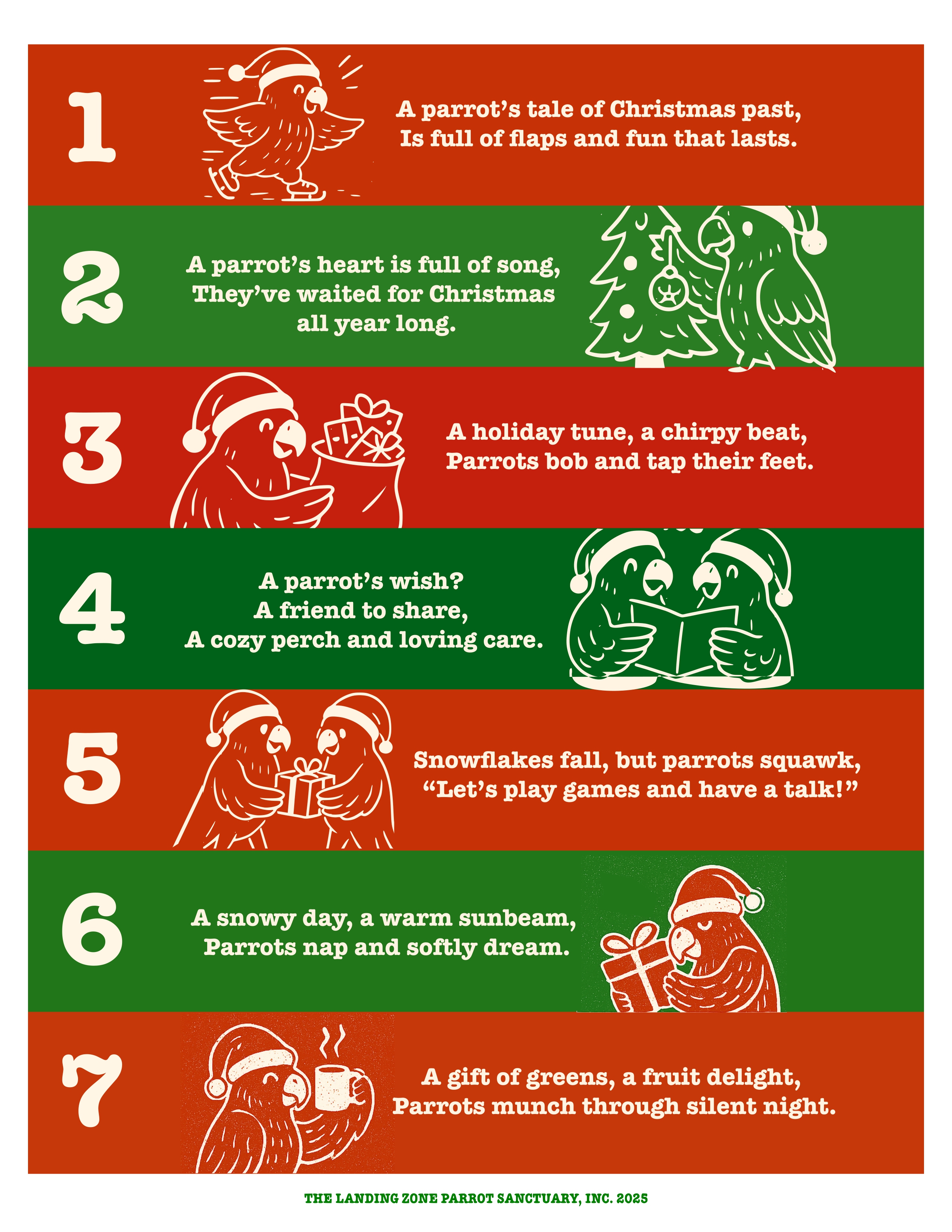 Designed with love by our sanctuary team, these festive wraps feature silly, expressive parrots and cozy holiday motifs. Perfect for kids and those who love cheerful giving- or anyone in need of last minute print-ready gift wrap!