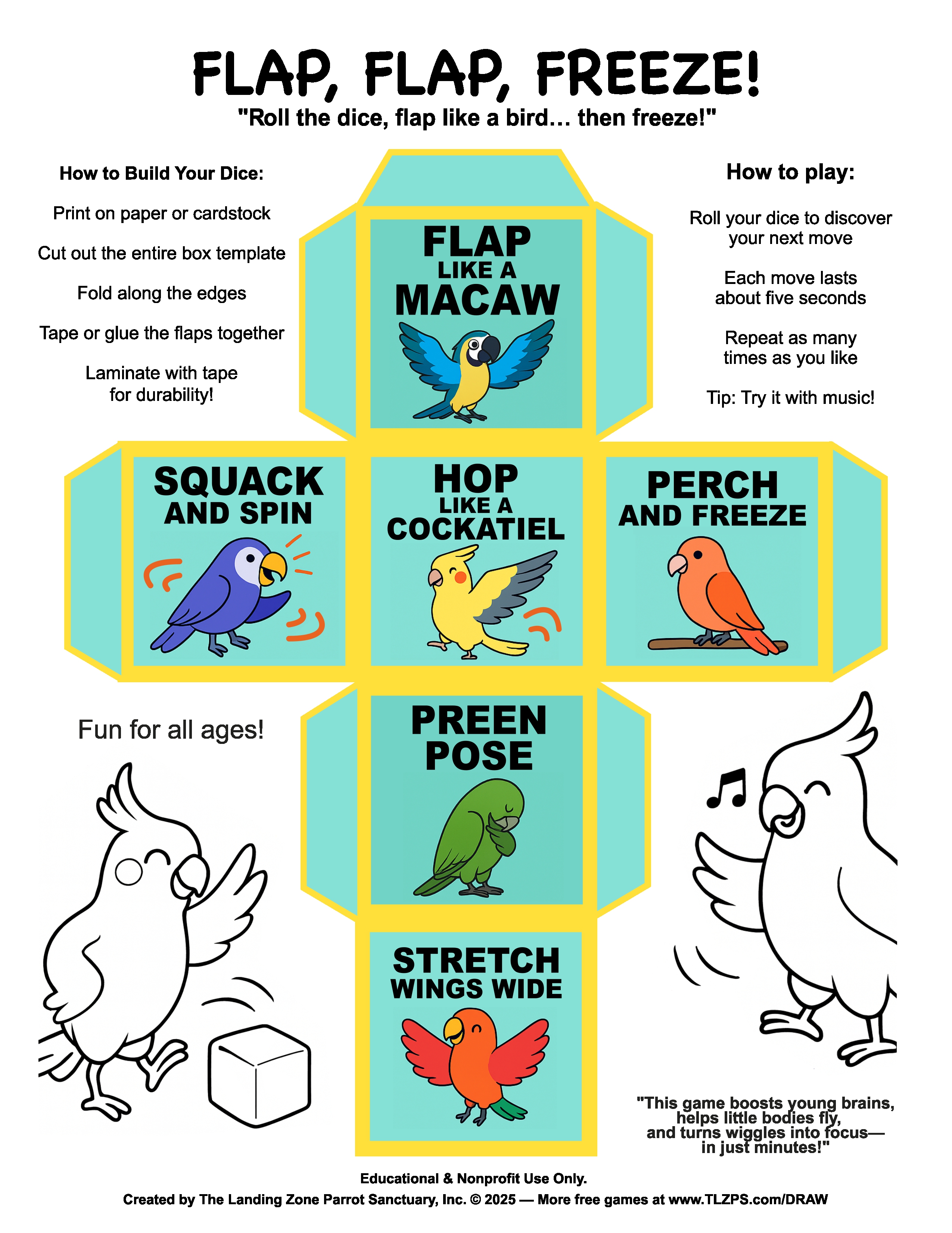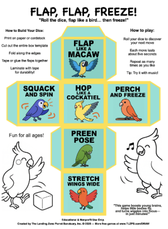 Roll the dice, flap like a bird… then freeze! - Roll your dice to discover your next move - Each move lasts about five seconds - Repeat as many times as you like - Tip: Try it with music! Build Your Dice: - Print on paper or cardstock - Cut out the template - Fold and tape or glue together ✨ Tips: Laminate with tape for durability!✨ Encase in tape over a carboard square for extra sturdy dice for the youngest players.